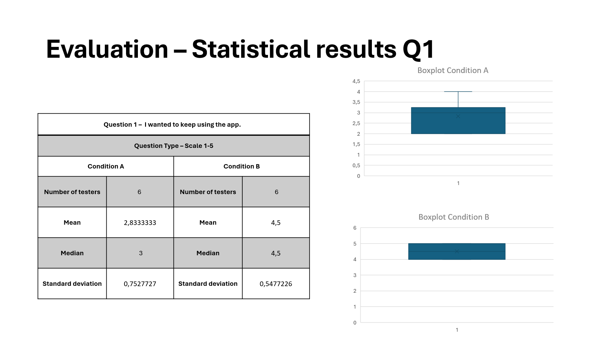 I hypothesized that gamification would make the app more engaging and attractive to use. The A/B test results clearly support my hypothesis. The results state that engagement, enjoyment, and motivation are all higher in Version B. However, unfortunately, usability and clarity are slightly lower in the gamified version, which suggests a need to refine onboarding or simplify game mechanics. These drawbacks were, however, not severe enough to outweigh the clear increases in user engagement and satisfaction.Possible future additions: